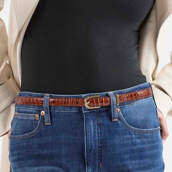 The Skinny Leather Gold Buckle Belt is designed to add an elevated accent to any ensemble. The thinner width belt brings just a hint of color to your look. The embossed logo design is a Brahmin signature. Made with genuine leather.