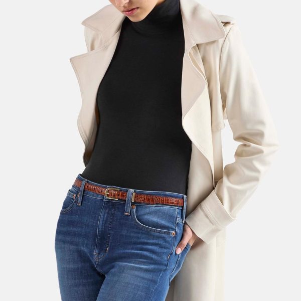 The Skinny Leather Gold Buckle Belt is designed to add an elevated accent to any ensemble. The thinner width belt brings just a hint of color to your look. The embossed logo design is a Brahmin signature. Made with genuine leather.